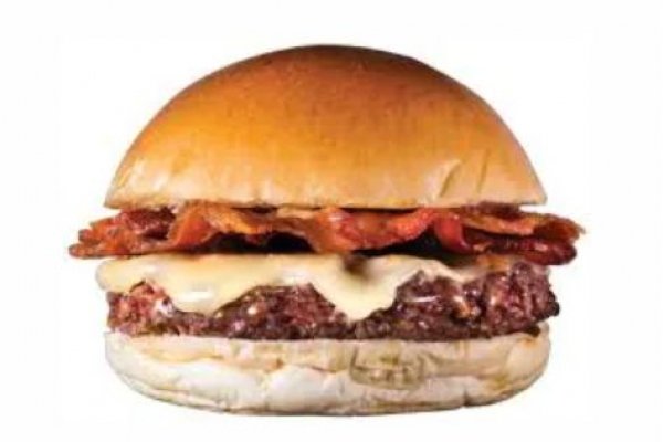 Hambúrguer, bacon, maionese e queijo.